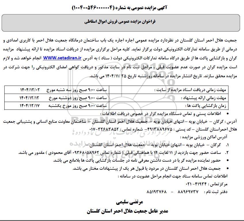جمعیت هلال احمر استان گلستان در نظر دارد مزایده عمومی اجاره اجاره یک باب ساختمان درمانگاه جمعیت هلال احمر با کاربری امدادی و درمانی از طریق سامانه تدارکات الکترونیکی دولت برگزار نماید کلیه مراحل برگزاری مزایده از دریافت اسناد مزایده تا ارائه پیشنهاد مزایده گران و بازگشایی پاکتها از طریق درگاه سامانه تدارکات الکترونیکی دولت ستاد ایران انجام خواهد شد و لازم است مزایده گران در صورت عدم عضویت قبلی، مراحل ثبت نام در سایت مذکور و دریافت گواهی امضای الکترونیکی را جهت شرکت در مزایده محقق سازند تاریخ انتشار مزایده در سامانه روزشنبه تاریخ 1404.11.25 می باشد.