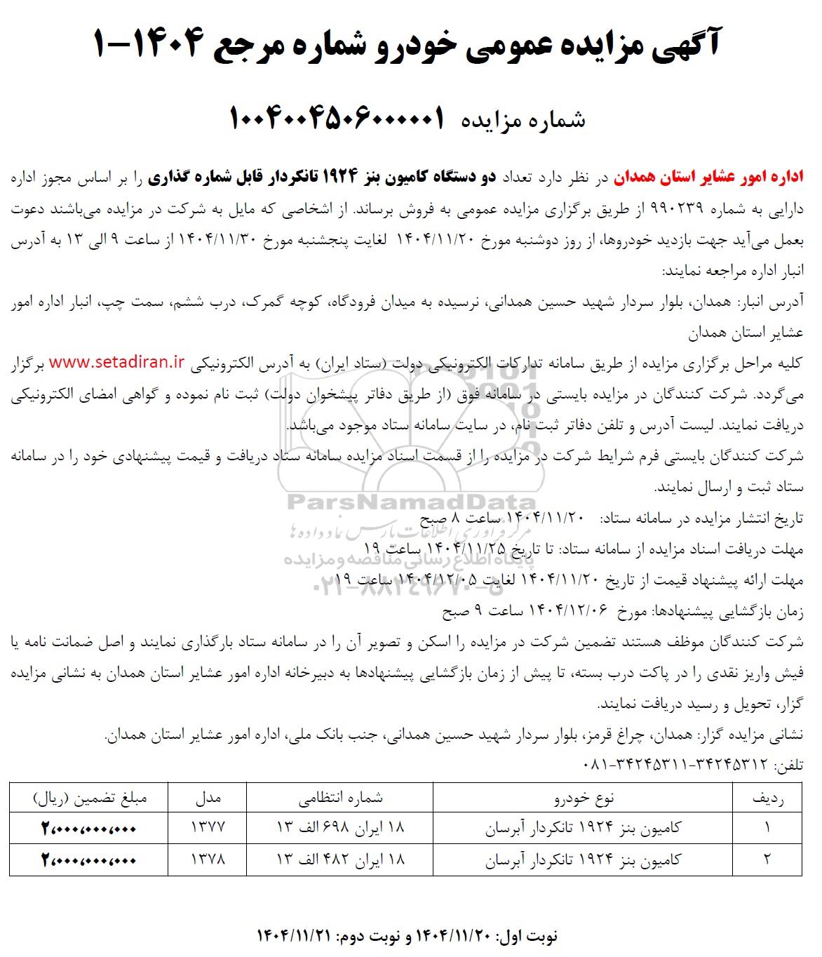 اداره امور عشایر استان همدان در نظر دارد تعداد دو دستگاه کامیون بنز 1924 تانکردار قابل شماره گذاری را بر اساس مجوز اداره دارایی به شماره 990239 از طریق برگزاری مزایده عمومی به فروش برساند. از اشخاصی که مایل به شرکت در مزایده میباشند دعوت بعمل می آید جهت بازدید خودروها از روز دوشنبه مورخ 1404.11.20 لغایت پنجشنبه مورخ 1404.11.30 از ساعت 9 الی 13 به آدرس انبار اداره مراجعه نمایند