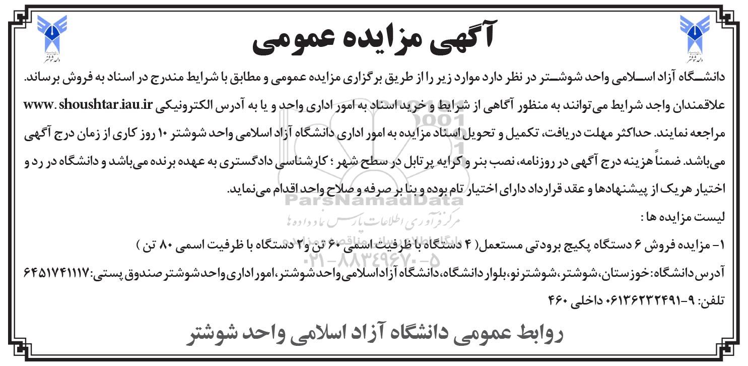 دانشگاه آزاد اسلامی واحد شوشتر در نظر دارد موارد زیر را از طریق برگزاری مزایده عمومی و مطابق با شرایط مندرج در اسناد به فروش برساند.