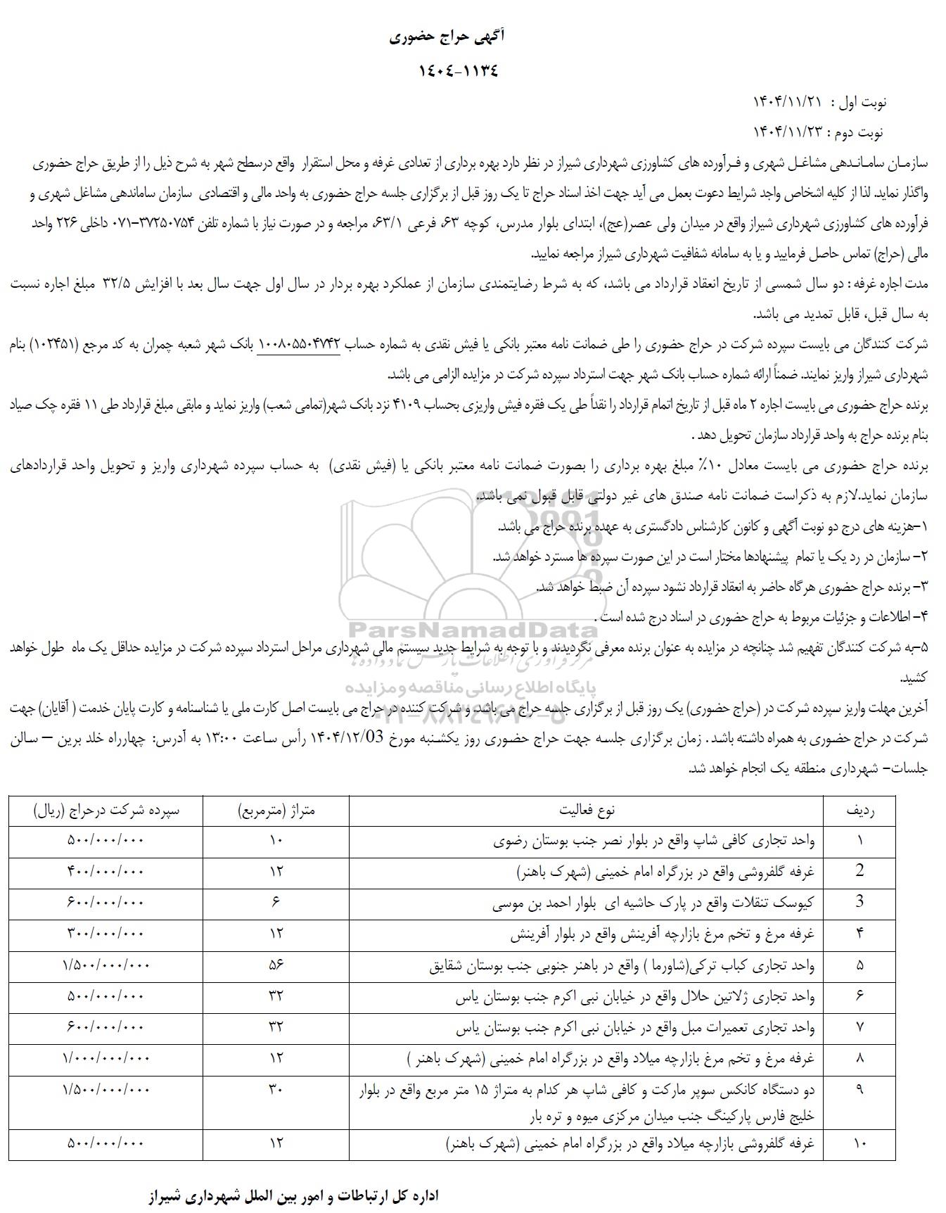 سازمان ساماندهی مشاغل شهری و فرآورده های کشاورزی شهرداری شیراز در نظر دارد بهره برداری از تعدادی غرفه و محل استقرار واقع در سطح شهر به شرح ذیل را از طریق حراج حضوری واگذار نماید. لذا از کلیه اشخاص واجد شرایط دعوت بعمل می آید جهت اخذ اسناد حراج تا یک روز قبل از برگزاری جلسه حراج حضوری به واحد مالی و اقتصادی سازمان ساماندهی مشاغل شهری و فرآورده های کشاورزی شهرداری شیراز واقع در میدان ولی عصر (عج)، ابتدای بلوار مدرس کوچه 63 فرعی 63.1 مراجعه و در صورت نیاز با شماره تلفن 37250754-071 داخلی 226 واحد مالی (حراج) تماس حاصل فرمایید و یا به سامانه شفافیت شهرداری شیراز مراجعه نمایید.