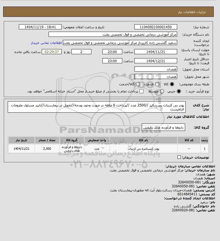 شرح کلی نیاز: پودر بی کربنات بی دیالیز //2500 عدد //پرداخت 6 ماهه در صورت وجود بودجه//تحویل در بیمارستان//تایید مسئول ملزومات الزامیست