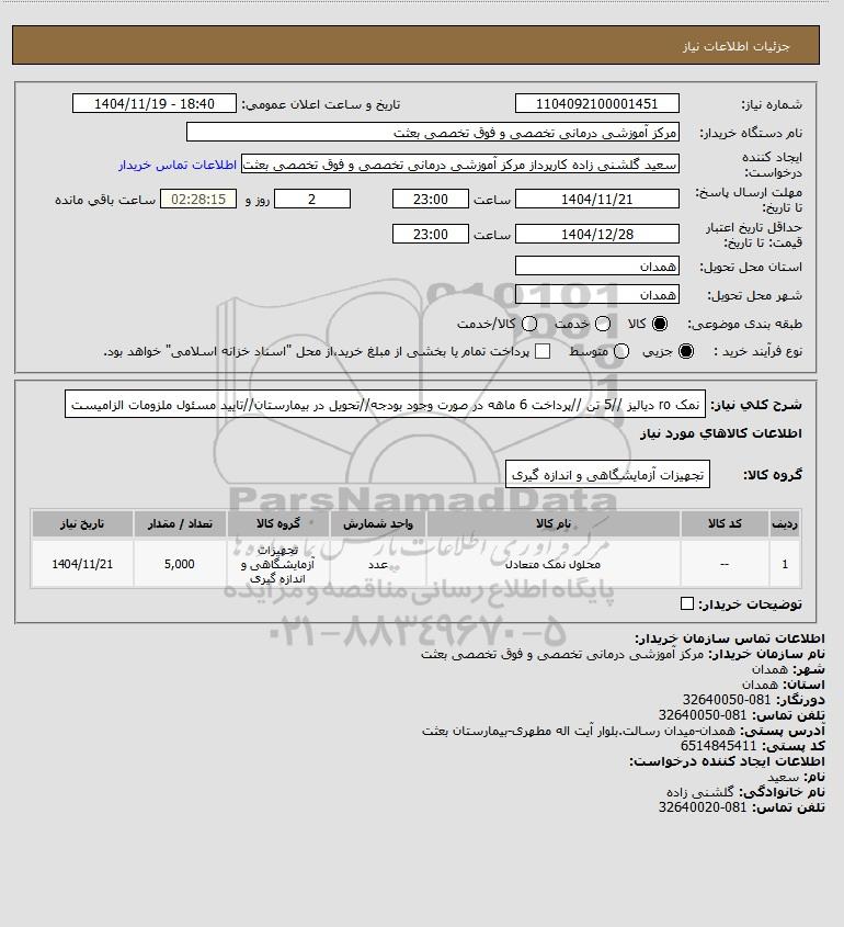 | 1 | -- | محلول نمک متعادل | عدد | تجهیزات آزمایشگاهی و اندازه گیری | 5,000 | 1404/11/21 |