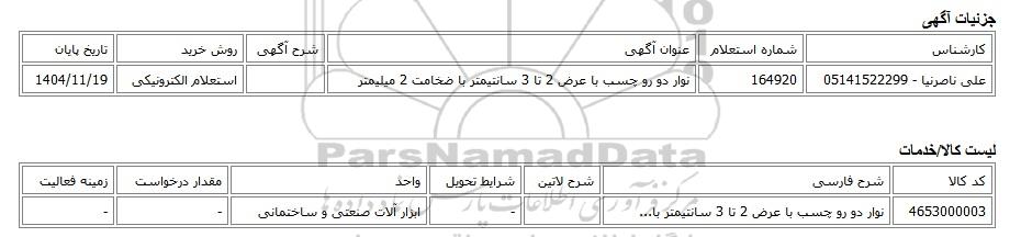 | علی ناصرنیا - 05141522299 | 164920 | نوار دو رو چسب با عرض 2 تا 3 سانتیمتر با ضخامت 2 میلیمتر | استعلام الکترونیکی | 1404/11/19 |