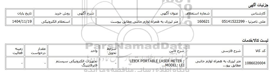 | علی ناصرنیا - 05141522299 | 160621 | متر لیزری به همراه لوازم جانبی مطابق پیوست | استعلام الکترونیکی | 1404/11/19 |