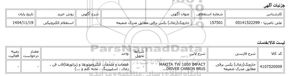 علی ناصرنیا - 05141522299157501جاروبک(زغال) بکس برقی مطابق مدرک ضمیمهاستعلام الکترونیکی1404/11/19