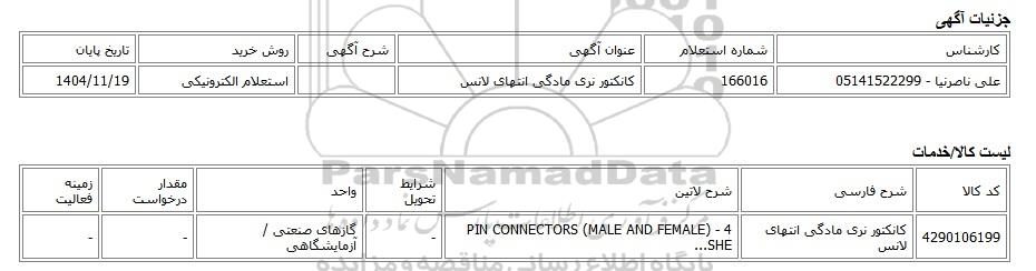 علی ناصرنیا - 05141522299166016کانکتور نری مادگی انتهای لانساستعلام الکترونیکی1404/11/19