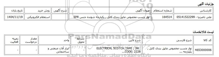 علی ناصرنیا - 05141522299164514نوار چسب مخصوص عایق بندی کابل , یکپارچه شونده جنس EPRاستعلام الکترونیکی1404/11/19