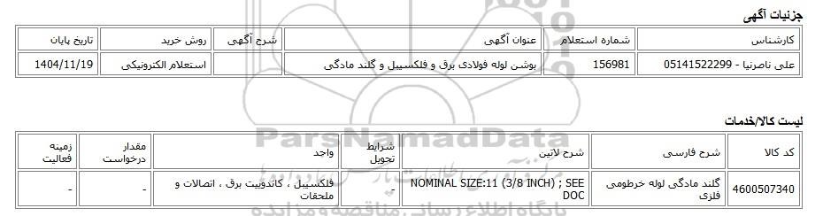 | علی ناصرنیا - 05141522299 | 156981 | بوشن لوله فولادی برق و فلکسیبل و گلند مادگی | استعلام الکترونیکی | 1404/11/19 |