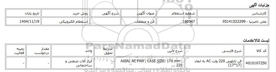 | علی ناصرنیا - 05141522299 | 160347 | فن و متعلقات | استعلام الکترونیکی | 1404/11/19 |