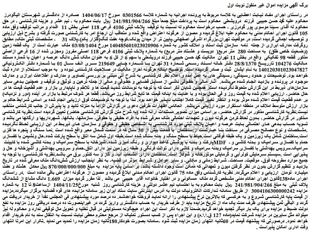 در راستای اجرای مفاد نیابت اعطایی به کلاسه مربوط به پرونده اجرائیه به شماره کلاسه 0301566  مورخ 1404/06/17  صادره از دادگستری شهرستان الیگودرز  محکوم علیه محمد حسن حبیبی  فرزند  درویشعلی  محکوم است به پرداخت مبلغ جمعاً مبلغ 241/981/904/266  ریال  بابت محکوم به ، نیم عشر و هزینه کارشناسی ، در حق محکوم له آقای سینا موسوی پور گودرزی ، حسب درخواست محکوم له نسبت به توقیف  پلاک ثبتی 4106 فرعی 118 اصلی بخش 11  اقدام و مراتب توقیف وفق ماده 105 قانون اجرای احکام مدنی به محکوم علیه ابلاغ گردیده و مصون از هرگونه اعتراض واقع شده و متعاقب آن ارجاع امر به کارشناس صورت گرفته و بشرح ذیل ارزیابی و توصیف اجمالی گردیده است: در موقعیت تهران،بزرگراه اشرفی اصفهانی،پایین تر از میدان پونک،کوچه هفت لنگ(گلزار یکم)،پلاک 31    ، مشخصات ثبتی ملک: مطابق روگرفت مدارک ابرازی از جمله  نامه  سازمان ثبت اسناد و املاک کشور به شماره 140485601023020906 مورخ 03/08/1404 ملک  عبارت است از  یک قطعه زمین (وضعیت خاص طلق)  به مساحت 280  متر مربع(  دویست و هشتاد متر مربع) به شماره پلاک ثبتی 4106 فرعی 118 اصلی مفروز ومجزی شده از 16 فرعی ازاصلی مذکور قطعه 98 تفکیکی  واقع در بخش 11 تهران  مالکیت محمد حسن حبیبی فرزند درویشعلی با سهم 6 از کل 6 به عنوان مالک شش دانگ عرصه و اعیان با شماره مستند مالکیت 104276 تارریخ 28/8/1370 دفتر خانه اسناد رسمی شماره 31 تهران با شماره چاپی 219649 سری الف سال 01 با شماره دفتر الکترونیکی 140120301023047827 به نام ایشان  ثبت و صادر گردیده است. توضیح اینکه هرگونه احراز مالکیت در صلاحیت کارشناس نبوده و  به موجب استعلام از اداره ثبت خواهد بود. توضیحات و حدود رسیدگی: رسیدگی های به عمل آمده و اعلام نظر کارشناسی به شرح آتی مبتنی بر بررسی تصاویر و مدارک و اطلاعات ابرازی و مدارک موجود در پرونده و بازدید انجام شده می باشد.  آثار مالی و حقوقی ناشی از مسایل قضایی و حقوقی و مالی از جمله ترهین و توثیق و توقیف و همچنین بدهی سایر سازمان های ذیربط در این گزارش ملحوظ نگردیده است. همچنین شایان ذکر است که با توجه به نوسانات شدید قیمت ها و تلاطم و ناپایداری بازار و عدم قطعیت قیمت ها در حال حاضر، ارزیابی اعلام شده به قیمت روز و فی الحال بوده و با عنایت به اینکه قیمت ها تابع شرایط روز می باشد، قطعا هر شوک مرتبط با بازار در آینده (دور و نزدیک) بر عدم قطعیت قیمت اعلام شده موثر بوده و انتظار تغییر قیمت کاملا اجتناب ناپذیر خواهد بود. لذا با توجه به توضیحات فوق ارزیابی انجام شده بر اساس شرایط حاکم بر بازار ارزش متوسط املاک در منطقه استقرار مورد ارزیابی می باشد.  انعکاس اظهارات طرفین دعوی در گزارش الزاماً به منزله تائید و یا پذیرش از جانب کارشناس منتخب نیست.نظریه کارشناسی مذکور در گزارش حاضر، بر اساس میزان تصویر مستندات ارائه شده (به شرح متن گزارش کارشناسی حاضر) تعیین گردیده است.نظریه کارشناسی مذکور در گزارش حاضر، بدون لحاظ کردن هرگونه دیون و تعهدات احتمالی ملک معرفی شده به افراد حقیقی یا حقوقی، سازمانها، بانکها، شهرداریها و ارگانها می باشد و تسویه حساب بدهی های احتمالی بابت عرصه و اعیان پلاک ثبتی مورد کارشناسی به اشخاص حقیقی و حقوقی و سازمان های ذیربط در این ارزیابی لحاظ نگردیده .مشخصات و نوع مصالح مصرفی در ساخت بنا عبارتست از:ساختمان  با قدمت بیش از 30 سال که در سمت شمال معبر واقع شده است .نما سنگ و پنجره ها فلزی است.ساختمان شامل یک زیرزمین و یک طبقه فوقانی است.حیاط با سطح سنگ و بدنه سنگ شده است.طبقه اول شامل سه اتاق با سطح پارکت شده،هال ونشیمن با کفسازی پارکت و بدنه با پوشش کاغذ دیواری و رنگ آمیزی شده،آشپزخانه با سطح سرامیک و بدنه کاشی شده با کابینت mdf ، حمام با کفسازی سرامیک و بدنه کاشی و سرامیک،سرویس بهداشتی با کفسازی سرامیک وبدنه سرامیک و کاشی دارای توالت فرنگی و طبقه زیرزمین نیز دارای اتاق،حمام و سرویس بهداشتی و آشپزخانه و هال و پذیرایی است .سیستم سرمایش کولرآبی و گرمایش موتورخانه و شوفاژ 