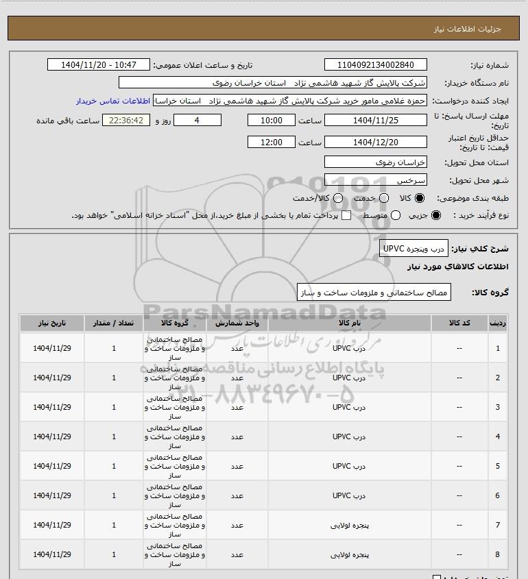 | 5 | -- | درب UPVC | عدد | مصالح ساختمانی و ملزومات ساخت و ساز | 1 | 1404/11/29 |