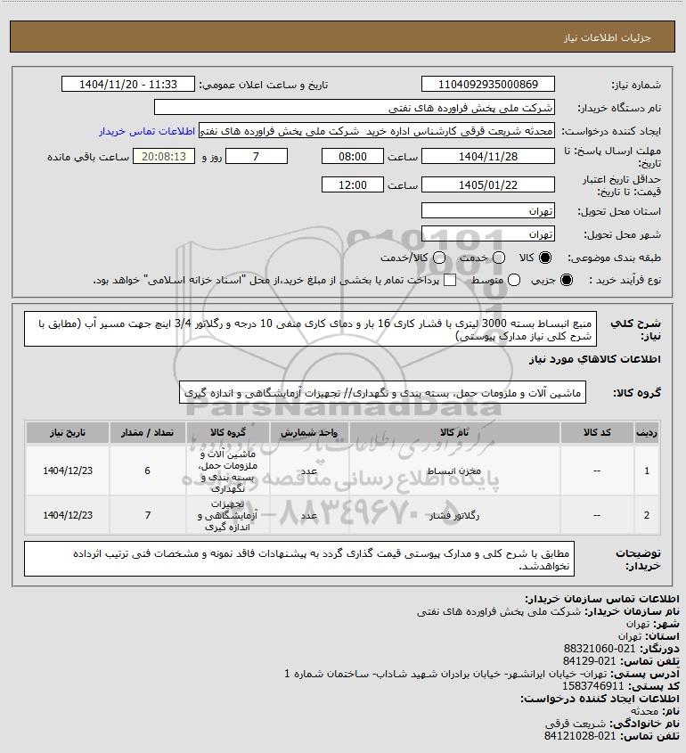 شرح کلی نیاز: منبع انبساط بسته 3000 لیتری با فشار کاری 16 بار و دمای کاری منفی 10 درجه و رگلاتور 3/4 اینچ جهت مسیر آب (مطابق با شرح کلی نیاز مدارک پیوستی)