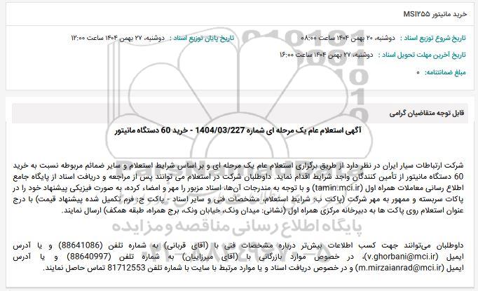 شرکت ارتباطات سیار ایران در نظر دارد از طریق برگزاری استعلام عام یک مرحله ای و بر اساس شرایط استعلام و سایر ضمائم مربوطه نسبت به خرید 60 دستگاه مانیتور از تأمین کنندگان واجد شرایط اقدام نماید. داوطلبان شرکت در استعلام می‏ توانند پس از مراجعه و دریافت اسناد از پایگاه جامع اطلاع رسانی معاملات همراه اول (tamin.mci.ir) و با توجه به مندرجات آن‌ها، اسناد مزبور را مهر و امضاء کرده، به صورت فیزیکی پیشنهاد خود را در پاکات سربسته و ممهور به مهر شرکت (پاکت ب: شرایط استعلام، مشخصات فنی و سایر اسناد - پاکت ج: فرم تکمیل شده پیشنهاد قیمت) با درج عنوان استعلام روی پاکت ها به دبیرخانه مرکزی همراه اول (نشانی: میدان ونک، خیابان ونک، برج همراه، طبقه همکف) ارسال نمایند.
