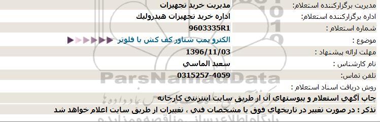 استعلام بها و موضوع استعلام استعلام, استعلام الکتروپمپ کف کش با فلوتر به اطلاع کلیه شرکتها و افراد متخصص واجد شرایط میرساند، آگهی گذار در نظر دارد از طریق استعلام بها، نسبت به انتخاب و دریافت پیشنهادات اقدام نماید. این استعلام با کد آگهی ثبت شده در سامانه خبرگزاری پارس نماد : 1027781 منتشر شده است. مشخصات استعلام : تاریخ شروع استعلام: 1396/10/26 آخرین مهلت ارسال پیشنهاد قیمت : 1396/11/03 و محل اجرای پروژه : استان اصفهان میباشد. استعلام قیمت مورد درخواست : استعلام, استعلام الکتروپمپ کف کش با فلوتر با دستهبندیهای تخصصی و گروه های مرتبط : الکتروموتور و پمپ های شناور, استعلام اطلاع رسانی میگردد.