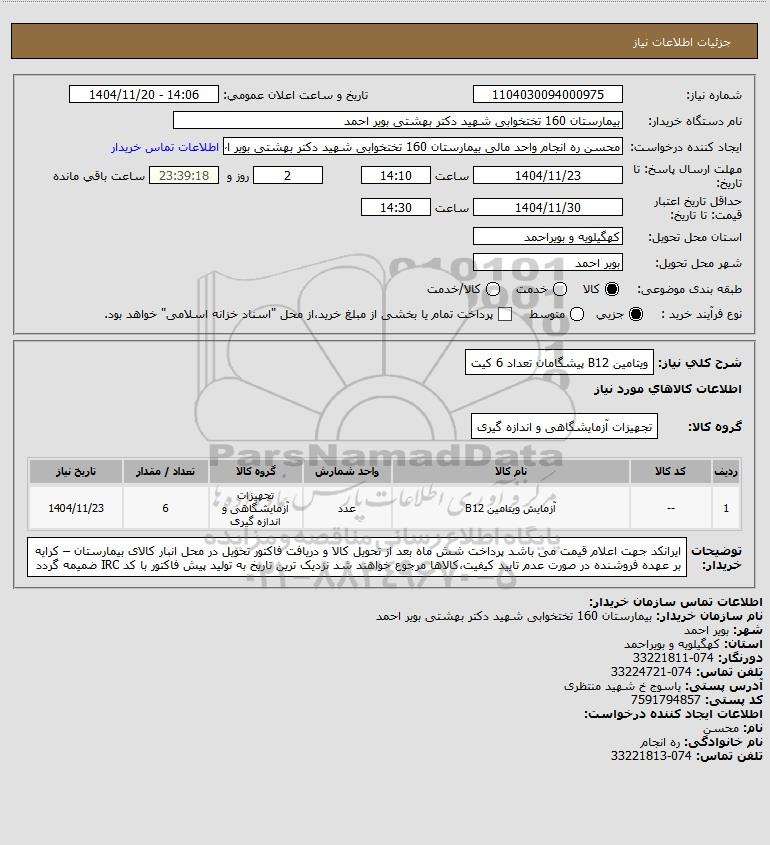 | 1 | -- | آزمایش ویتامین B12 | عدد | تجهیزات آزمایشگاهی و اندازه گیری | 6 | 1404/11/23 |