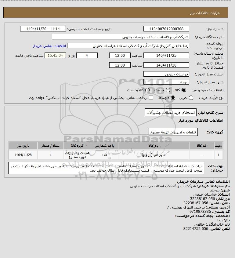 شرح کلی نیاز: استعلام خرید اتصالات وشیرآلات
