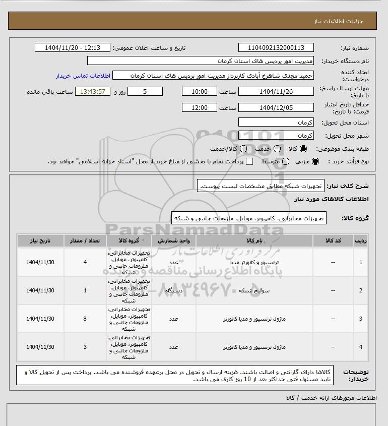 | 1 | -- | ترنسیور و کانورتر مدیا | عدد | تجهیزات مخابراتی، کامپیوتر، موبایل، ملزومات جانبی و شبکه | 4 | 1404/11/30 |