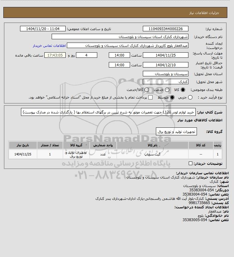 شرح کلی نیاز: خرید لوازم لودر L120 جهت تعمیرات موتور به شرح تبیین در برگهای استعلام بها ( بارگذاری شده در مدارک پیوست)