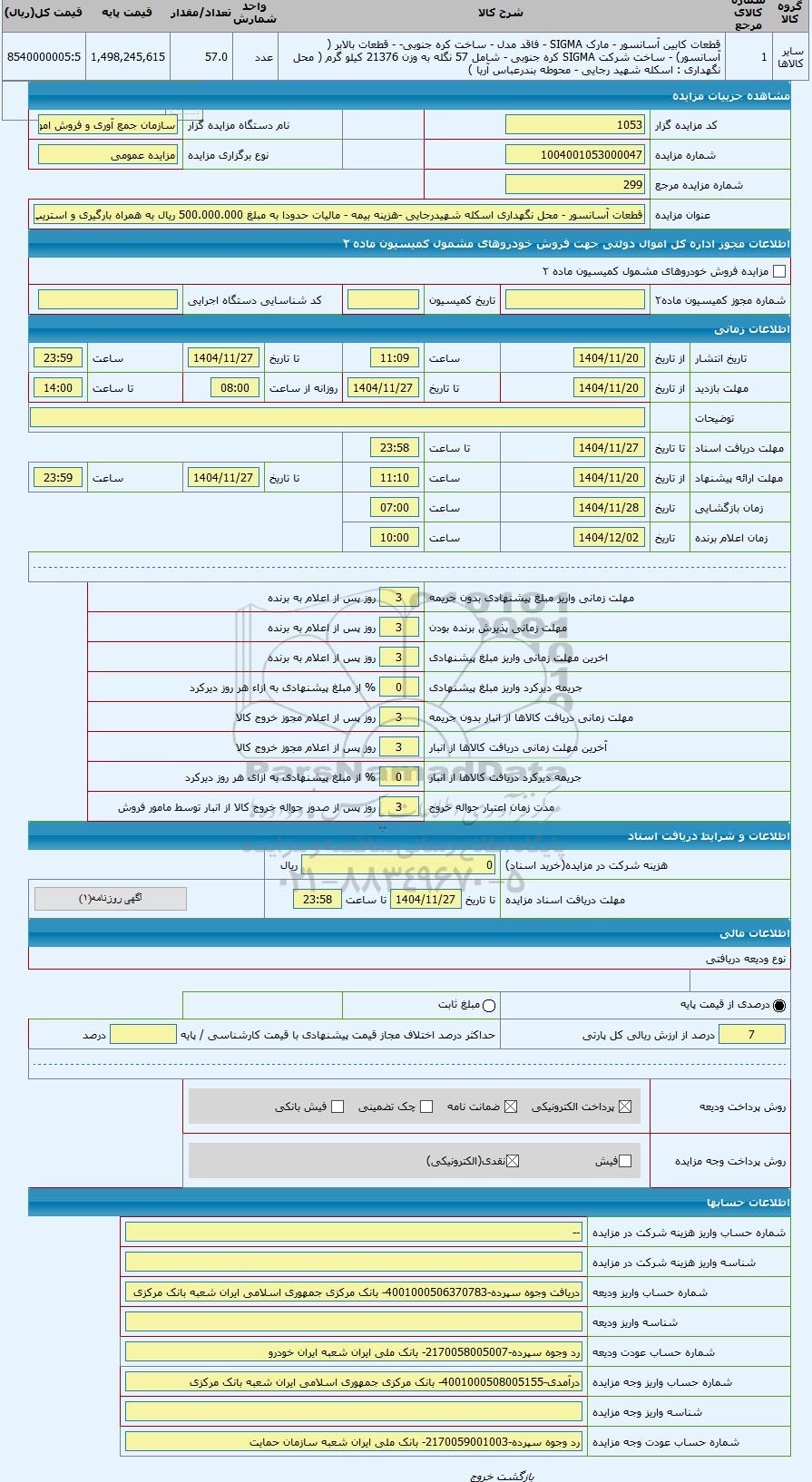 | کد مزایده گزار | 1053 | نام دستگاه مزایده گزار | سازمان جمع آوری و فروش اموال تملیکی | |