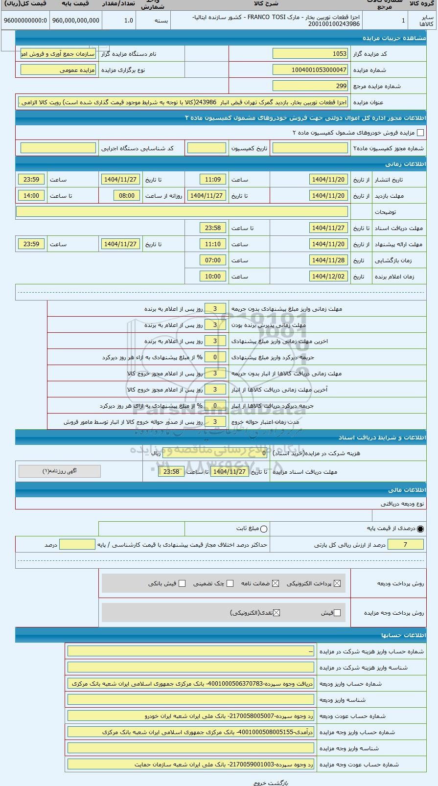 | کد مزایده گزار | 1053 | نام دستگاه مزایده گزار | سازمان جمع آوری و فروش اموال تملیکی | |