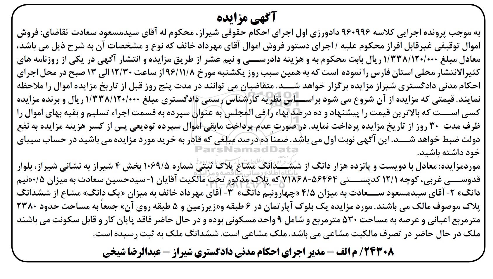 مزایده پلاک ثبتی شماره 1069/5 بخش چهار شیراز کلاسه 960996