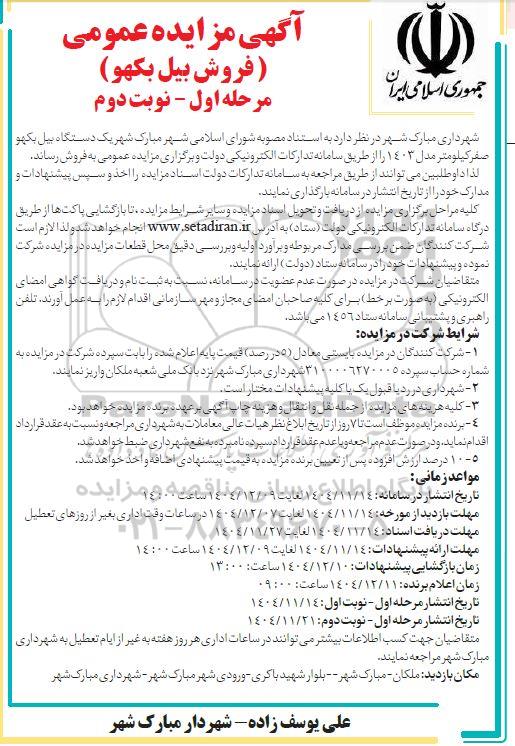 شهرداری مبارک شهر در نظر دارد به استناد مصوبه شورای اسلامی شهر مبارک شهر یک دستگاه بیل بکهو صفر کیلومتر مدل 1403 را از طریق سامانه تدارکات الکترونیکی دولت و برگزاری مزایده عمومی به فروش رساند. لذا داوطلبین میتوانند از طریق مراجعه به سامانه تدارکات دولت اسناد مزایده را اخذ و سپس پیشنهادات و مدارک خود را از تاریخ انتشار در سامانه بارگذاری نمایند.