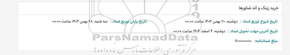 مناقصه خرید زینک و آند شناورها -مناقصه روز سه شنبه بیست و یکم بهمن ماه 1404 از کلیه افراد متخصص و شرکتها واجد شرایط دعوت به عمل میآید در مناقصه با کد خبرگزاری پارس نماد: 10288112 شرکت نمایند.