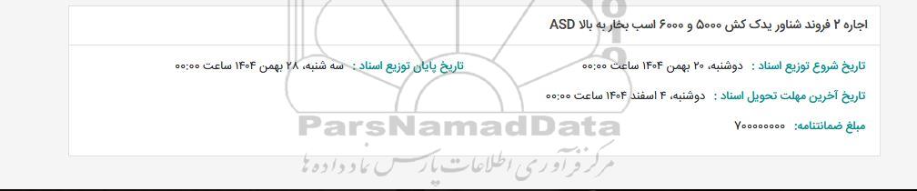 علاقهمندان میتوانند جهت دریافت اسناد و اطلاعات تکمیلی، مناقصه اجاره 2 فروند شناور یدک کش 5000 و 6000 اسب بخار به بالا ASD-مناقصه روز سه شنبه بیست و یکم بهمن ماه 1404 با سامانه مناقصات و مزایدات ایران پارسنماد داده ها 88349670 تماس حاصل نمایند.