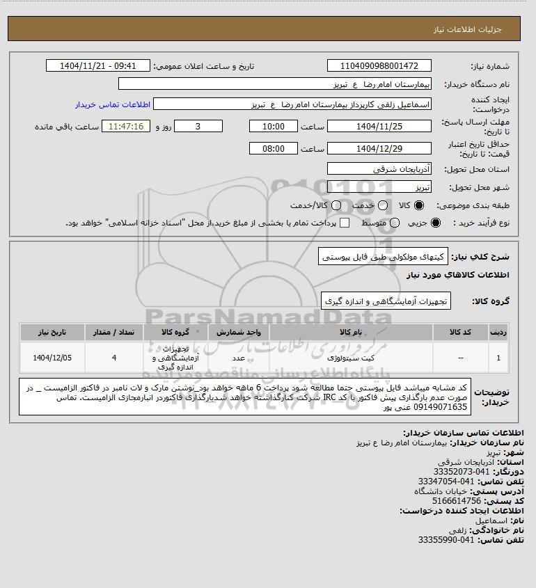 | 1 | -- | کیت سیتولوژی | عدد | تجهیزات آزمایشگاهی و اندازه گیری | 4 | 1404/12/05 |