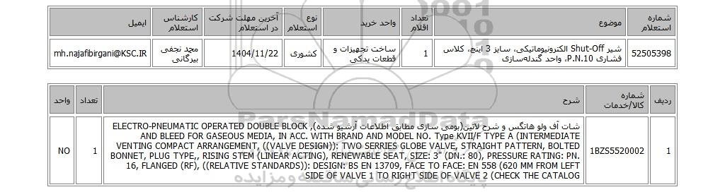 52505398شیر Shut-Off الکترونیوماتیکی، سایز 3 اینچ، کلاس فشاری P.N.10، واحد گندله سازی1ساخت تجهیزات و قطعات یدکیکشوری1404/11/22محمد نجفی بیرگانیmh.najafibirgani@KSC.IR