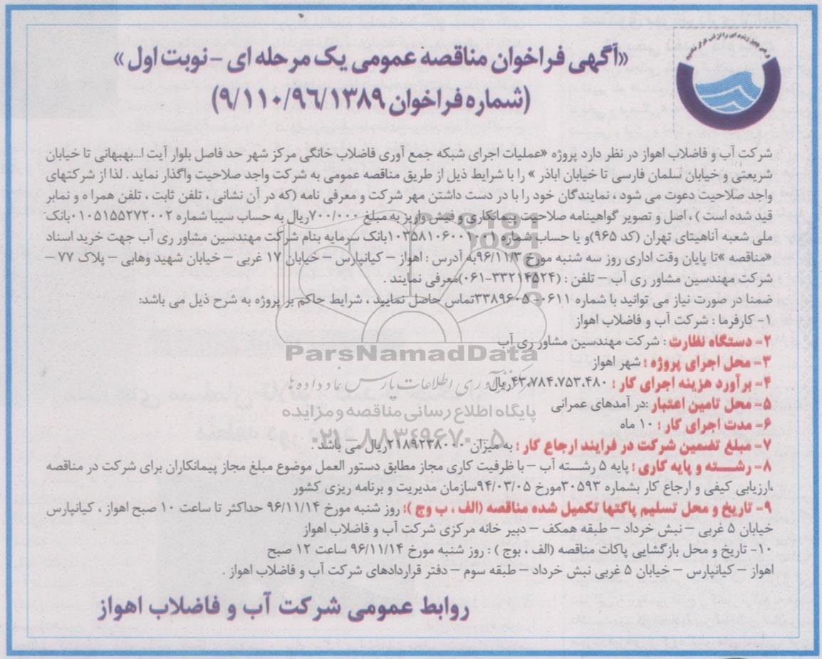 شرکت آب و فاضلاب اهواز به عنوان دستگاه مناقصه گزار در نظر دارد پروژه عملیات اجرای شبکه جمع آوری فاضلاب خانگی مرکز شهر حد فاصل بلوار آیت ا... بهبهانی تا خیابان شریعتی و خیابان سلمان فارسی تا خیابان اباذر را با شرایط ذیل از طریق مناقصه عمومی به شرکت واجد صلاحیت واگذار نماید لذا از شرکت های واجد صلاحیت دعوت می شود، نمایندگان خود را با در دست داشتن مهر شرکت و معرفی نامه (که در آن نشانی، تلفن ثابت، تلفن همراه و نمابر قید شده است)، اصل و تصویر گواهینامه صلاحیت پیمانکاری و فیش واریز به مبلغ 700.000 ریال به حساب سیبا شماره 0105155272002 بانک ملی شعبه آناهیتای تهران (کد 965) و یا به حساب شماره 10358106001001 بانک سرمایه به نام شرکت مهندسین مشاور ری آب جهت خرید اسناد «مناقصه» تا پایان وقت اداری روز 3شنبه مورخ 96.11.3 به آدرس اهواز، کیانپارس، خیابان 17 غربی، خیابان شهید وهابی، پلاک 77 ، شرکت مهندسین مشاور ری آب تلفن 33214524-061 معرفی نمایند.