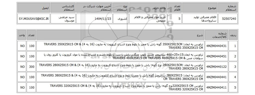 | 52507240 | اقلام مصرفی تولید سایرواحدها | 5 | خرید مواد مصرفی و اقلام عمومی | کشوری | 1404/11/23 | سید مرتضی موسوی | SY.MOUSAVI@KSC.IR |