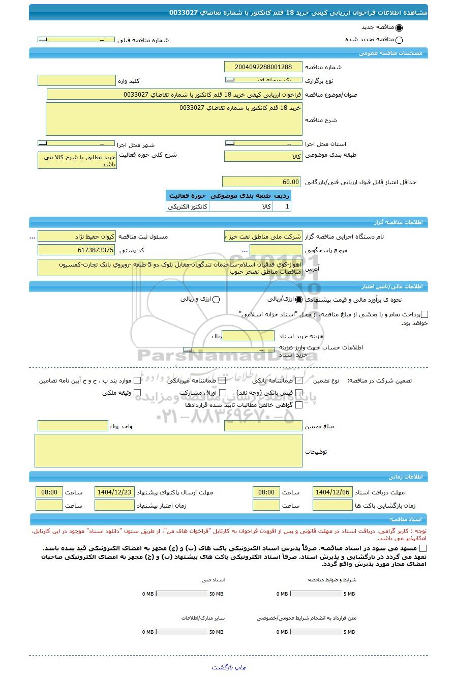عنوان/موضوع مناقصه فراخوان ارزیابی کیفی خرید 18 قلم کانکتور با شماره تقاضای 0033027