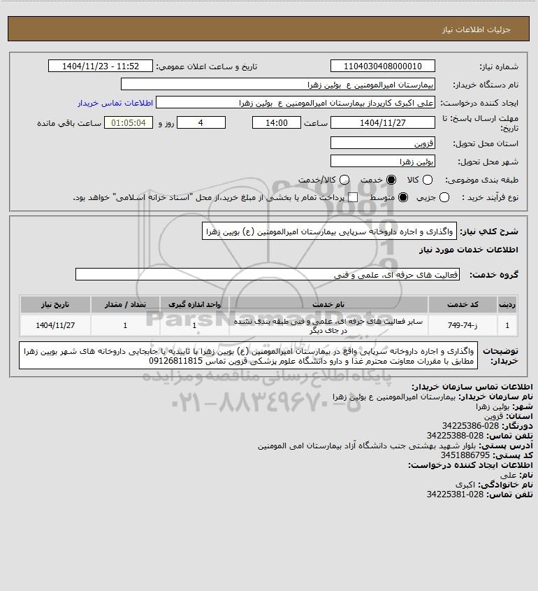 مزایده عمومی استعلام واگذاری و اجاره داروخانه سرپایی بیمارستان امیرالمومنین (ع) بویین زهرا برگزار میگردد. از کلیه افراد متخصص و شرکت‌های واجد شرایط دعوت به عمل می‌آید تا در این مزایده با کد خبرگزاری پارس نماد : 10292293 شرکت نمایند تاریخ شروع مزایده : 1404/11/23 مهلت شرکت در مزایده: تا پایان روز 1404/11/27 مکان برگزاری اموال واگذاری استان‌های مزایدات استان قزوین و دسته‌بندی‌های مربوط به این حراجی خدمات دارویی میباشد.