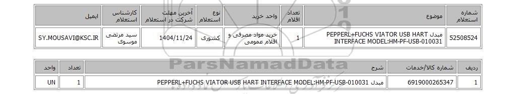 | 52508524 | مبدل PEPPERL+FUCHS VIATOR USB HART INTERFACE MODEL:HM-PF-USB-010031 | 1 | خرید مواد مصرفی و اقلام عمومی | کشوری | 1404/11/24 | سید مرتضی موسوی | SY.MOUSAVI@KSC.IR |