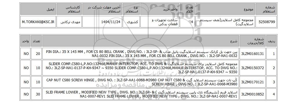 | 52508799 | مجموعه کامل اسلایدر(نصف سیستم اسلایدگیت) | 4 | ساخت تجهیزات و قطعات یدکی | کشوری | 1404/11/24 | مهدی ترکانی | M.TORKANI@KSC.IR |