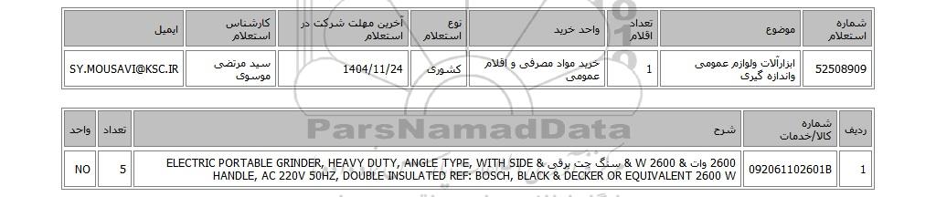 | 52508909 | ابزارآلات ولوازم عمومی واندازه گیری | 1 | خرید مواد مصرفی و اقلام عمومی | کشوری | 1404/11/24 | سید مرتضی موسوی | SY.MOUSAVI@KSC.IR |