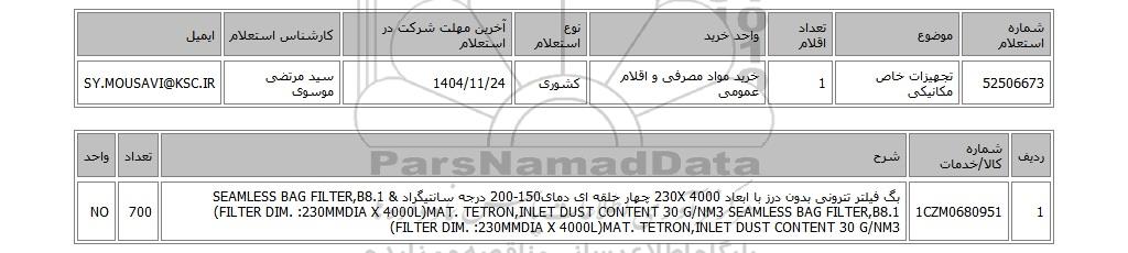 52506673تجهیزات خاص مکانیکی1خرید مواد مصرفی و اقلام عمومیکشوری1404/11/24سید مرتضی موسویSY.MOUSAVI@KSC.IR