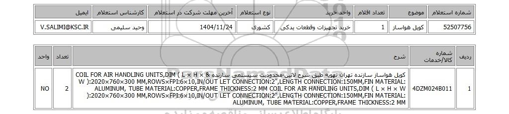 | 52507756 | کویل هواساز | 1 | خرید تجهیزات وقطعات یدکی | کشوری | 1404/11/24 | وحید سلیمی | V.SALIMI@KSC.IR |