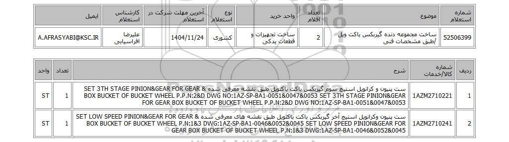 | 52506399 | ساخت مجموعه دنده گیربکس باکت ویل /طبق مشخصات فنی | 2 | ساخت تجهیزات و قطعات یدکی | کشوری | 1404/11/24 | علیرضا افراسیابی | A.AFRASYABI@KSC.IR |