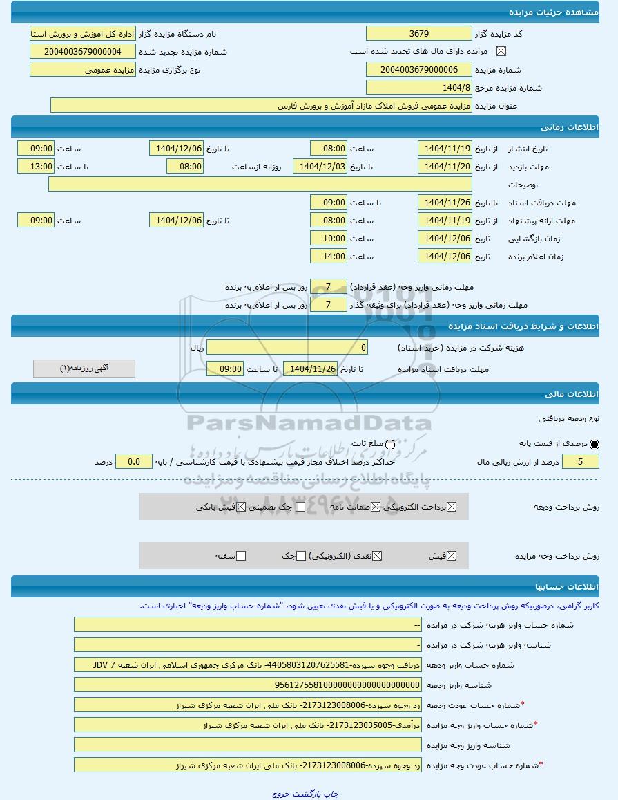 | عنوان مزایده | مزایده عمومی فروش املاک مازاد آموزش و پرورش فارس -مزایده ساختمان - استان فارس | |||