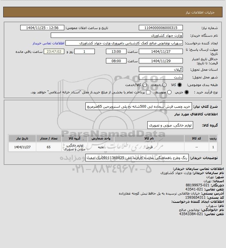 شرح کلی نیاز: خرید ونصب فرش سجاده ایی 500شانه نخ پلی استرویرجین 65مترمربع