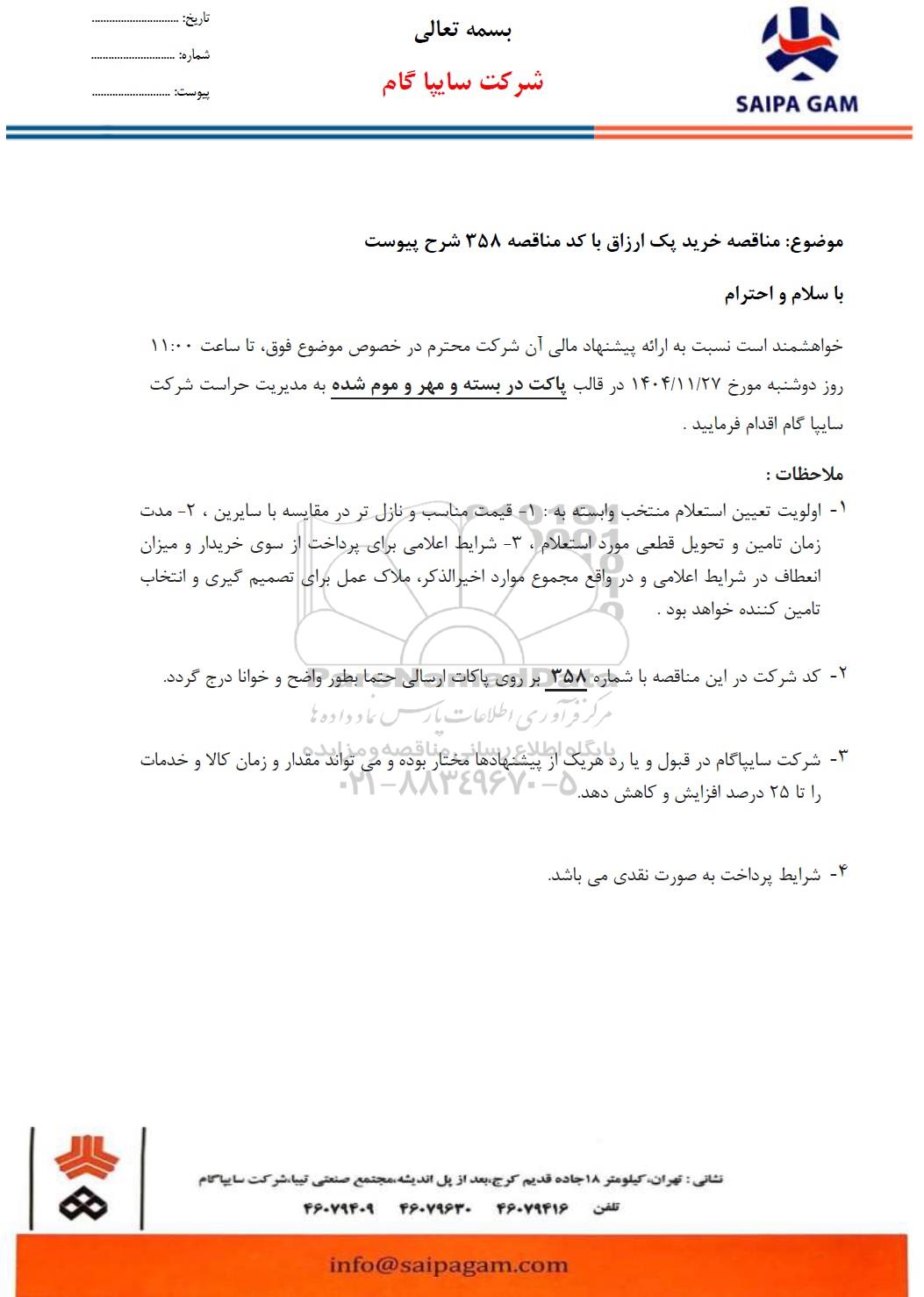 خواهشمند است نسبت به ارائه پیشنهاد مالی آن شرکت محترم در خصوص موضوع فوق، تا ساعت 11:00 روز دوشنبه مورخ 1404.11.27 در قالب پاکت در بسته و مهر و موم شده به مدیریت حراست شرکت سایپا گام اقدام فرمایید .