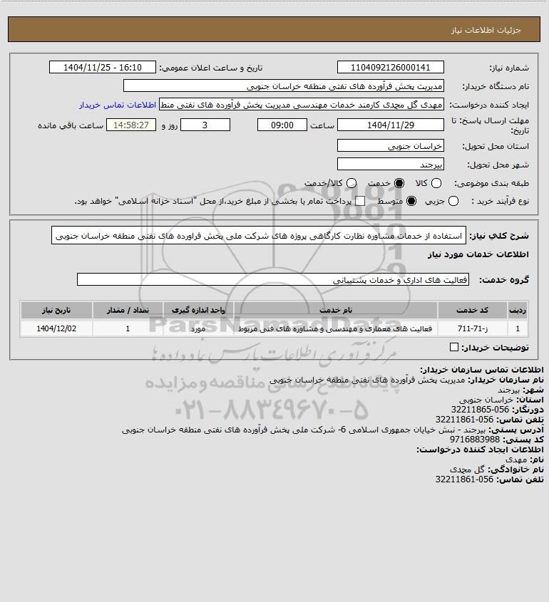 شرح کلی نیاز: استفاده از خدمات مشاوره نظارت کارگاهی پروژه های شرکت ملی پخش فراورده های نفتی منطقه خراسان جنوبی