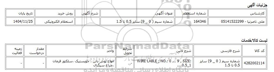 | علی ناصرنیا - 05141522299 | 164346 | شماره سیم ( 0 _ 9) سایز 0.5 تا 1.5 | استعلام الکترونیکی | 1404/11/25 |