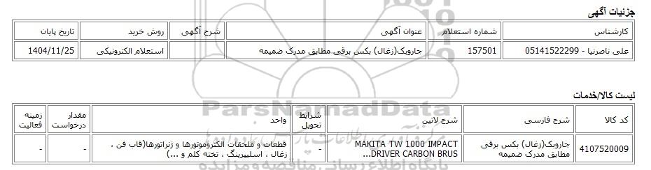 | علی ناصرنیا - 05141522299 | 157501 | جاروبک(زغال) بکس برقی مطابق مدرک ضمیمه | استعلام الکترونیکی | 1404/11/25 |