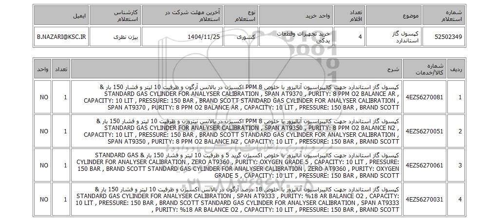 | 52502349 | کپسول گاز استاندارد | 4 | خرید تجهیزات وقطعات یدکی | کشوری | 1404/11/25 | بیژن نظری | B.NAZARI@KSC.IR |