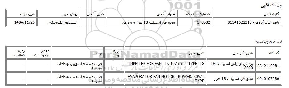 ناصر امان آبادی - 05141522310178682موتور فن اسپیلت 18 هزار و پره فناستعلام الکترونیکی1404/11/25