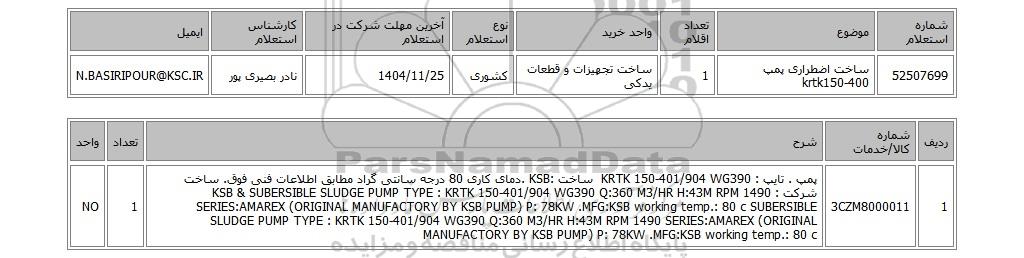 | 52507699 | ساخت اضطراری پمپ krtk150-400 | 1 | ساخت تجهیزات و قطعات یدکی | کشوری | 1404/11/25 | نادر بصیری پور | N.BASIRIPOUR@KSC.IR |