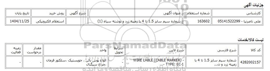 | علی ناصرنیا - 05141522299 | 163602 | شماره سیم سایز 1.5 تا 4 با زمینه زرد و نوشته سیاه (1) | استعلام الکترونیکی | 1404/11/25 |